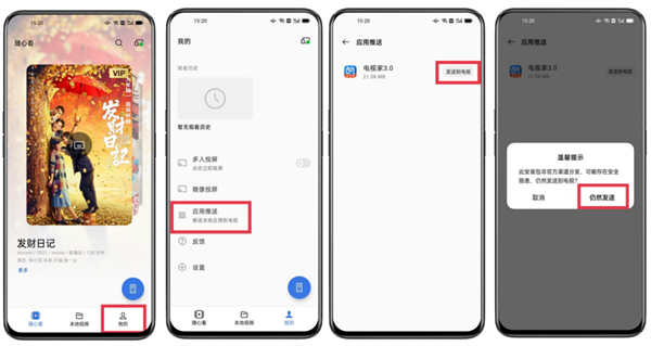 2、打开手机OPPO电视助手 > 我的 > 应用推送,选择安装包推送到电视。