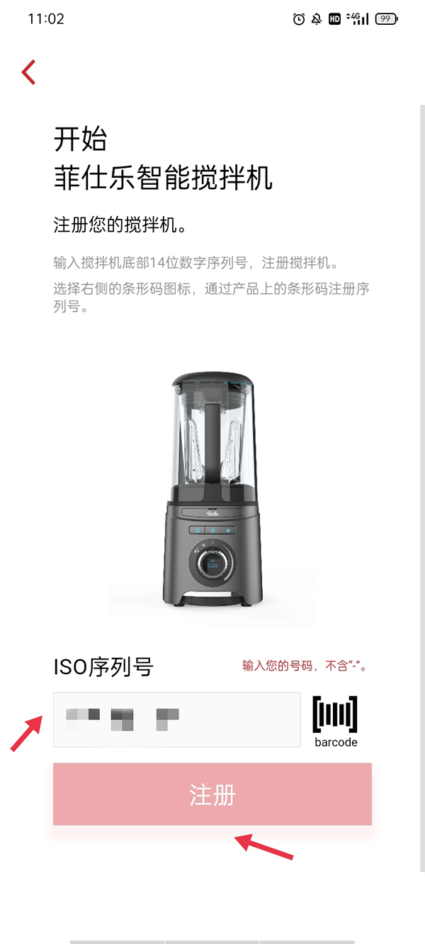 5、把这些信息全部输好之后,最后输入菲仕乐智能搅拌机的ISO序列号,在输入序列号的时候不要含“-”。