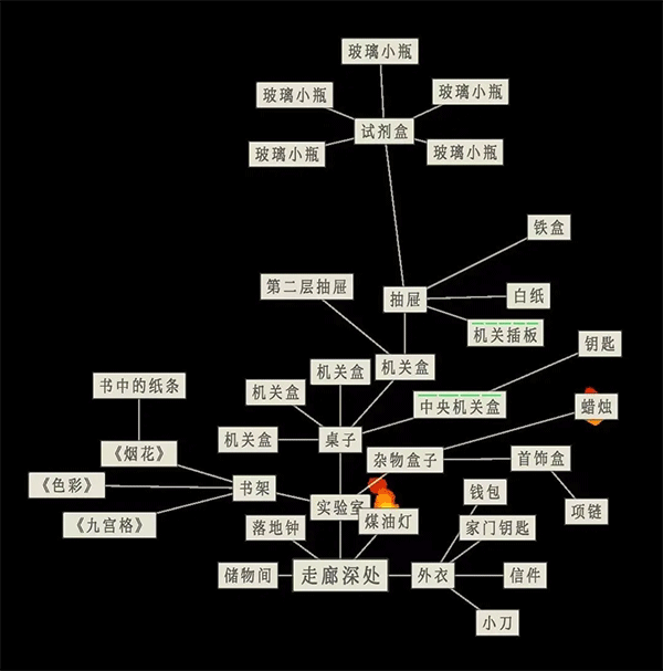 2、根据办公室抽屉泛黄的文件得到提示,把储物柜白纸、女士皮包折叠的黄纸、外衣里的信件,都拿到煤油灯去烤一烤,得到新线索