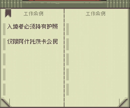 一名阿什托兹卡人(玩家)因抽中劳动彩票而成为东格莱斯丁边检站的工作人员,而你的工作就是审核入境的人员资料,并且盖下放行或是不放行的印章,当然每天的结束都会有不同的突发事件。比如报纸上说外来人员抢占了本地人的工作,这时你的边检工作中就会多一项检查工作证的要求,或者是报纸上报道有人体炸弹,这时你就要进行身体检查等等,这正是藏在游戏玩法中的剧情主线。