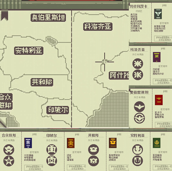 其中“阿什托兹卡”是我们的背景城市,其他皆为外国入境城市。那么外国入境城市是没有行政区的,他们有外交专用章,所以国家签证上会印有相应的LOGO图案,如不符合,则为伪造(如大爷)。