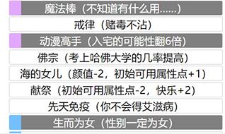游戏还有破解版,支持多项天赋选择,并且属性点可以直接拉满,直接无敌。特别是魔法棒的使用,可以让你的角色变成魔法少女,但需要满足颜值高、年龄小等条件。此外,游戏还加入了修仙、五行大道等元素,让结局通关变得更有挑战性。