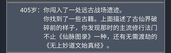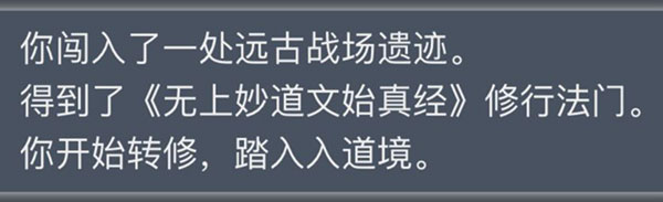 6、修仙化神之后会撕破虚空,然后有概率闯入远古战场遗迹,概率获得《无上妙道文始真经》可以继续修仙,然后羽化飞升。