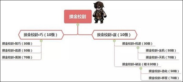 摸金校尉在10级的时候有两条大的转职路线,分别是巧路线和谋路线。其中,巧路线在30级的时候可以转为智巧,50级的时候可以转为诡道,70级的时候转为莫测。