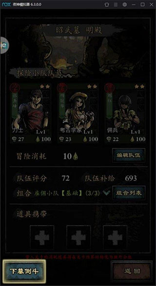 作为新入玄城的摸金好手,遇到的第一张地图便是昭武墓,技艺还有稍许生疏没关系,接下来是关于游戏初章-昭武墓-明殿关卡的攻略概要,希望能让各位对玄城通关有一些简单了解。点击“外出冒险”-“昭武墓”进入明殿关卡。初始系统会分派三位固定的探险小队队员,分别是力士、考古学家以及佣兵。力士为近战高防御职业,考古学家以及佣兵为远程高伤职业,需要合理搭配使用。