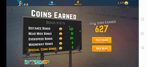 不小心失败后可以选择再来一次(play again),或者返回主菜单(main menu),多次失败后需要加油,你可以选择左边的按钮观看广告加油,或者氪金加油。