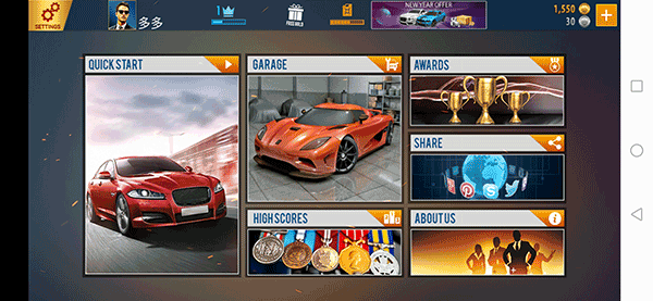 首先打开游戏,主界面从左往右分别是quick start(快速比赛)-garage(车库)-high scores(高分榜)-awards(奖杯)-share(分享)-aboutus(关于);