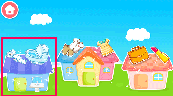 1、打开游戏,找到并点击最左边红色方框内的“厕所”场景按钮;