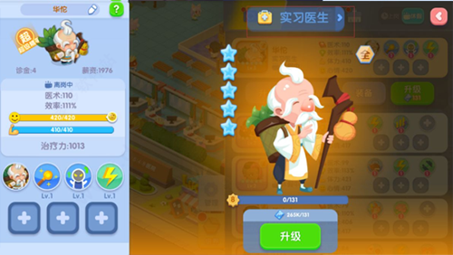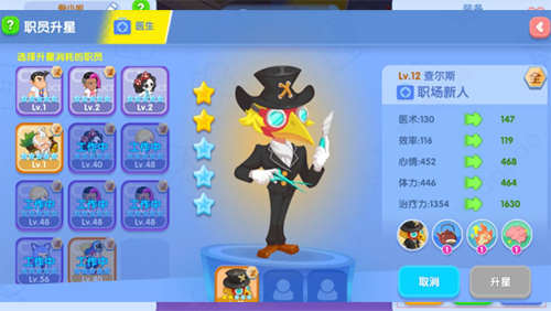 通过医治病人和完成日常订单等任务获取职员经验值对职员进行升级,职员等级达到一定级别的时候可以通过职员证书晋升职员。