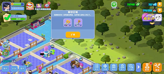 1、想要装饰医院的室外,我们首先得先解锁区域,第一个区域7级就可以开始扩展了,当扩展到你觉得合适的规格时,我们就可以来装饰室外了。