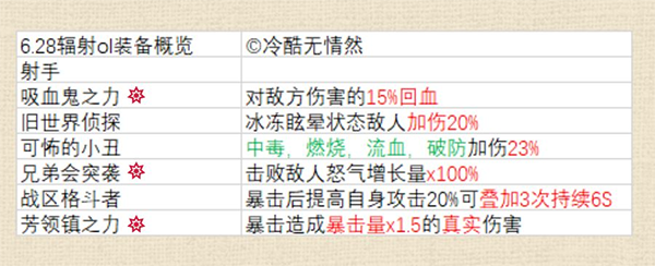 我们可以看见,在这个版本的辐射ol之中,射手装备共分为6种,拥有不同的效果,在目前大多数主流阵容之中,最实用的就是吸血鬼,兄弟会突袭,芳龄镇这三个,首先来说说没有上榜的装备