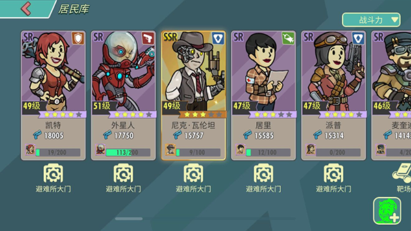 5、派遣居民去储藏室、训练室,或者去废土探险。去废土探险会获得武器和装备。探险的居民,要选择各项属性综合较高的,居民属性越高,在废土存活的时间越久。记得装备衣服和武器,带一些治愈剂和消辐宁。