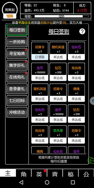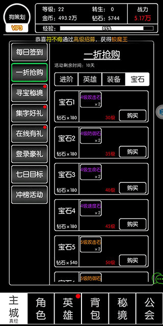 2、领完以后点击一折抢购把进阶经验丹全买了,接着英雄选项买到英雄4,宝石全买(这时你会发现自己的ViP升到3级,VIP是通过消费砖石提升的,在把VIP礼包全买了这里推荐V7以前的礼包可以买v7后面的礼包看个人感觉性价比不是那么高)现在差不多我们又有40来个招募令只要脸不黑凑齐5个橙色英雄是没问题(橙色英雄也有分4技英雄和3技英雄现在就开始培养培养4技英雄,3技英雄可以直接放弃拿去炼妖台转换其他橙色英雄)。
