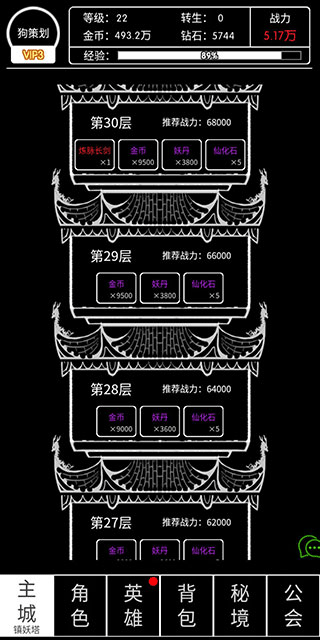 3、把买来的宝石和装备更换完以后点击主城的镇妖塔进行闯塔(镇妖塔每5层的奖励都是非常好招募令,橙色英雄,极品装备都是出自这里)。