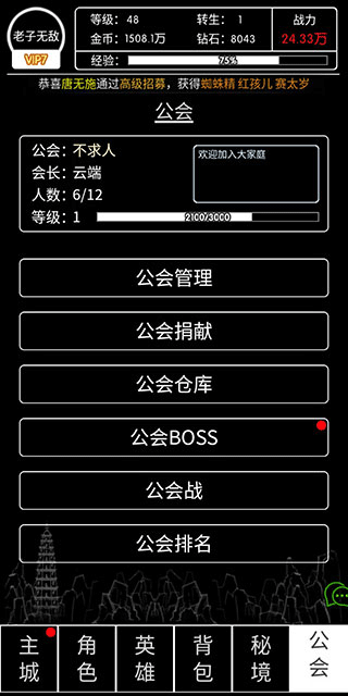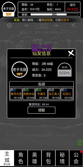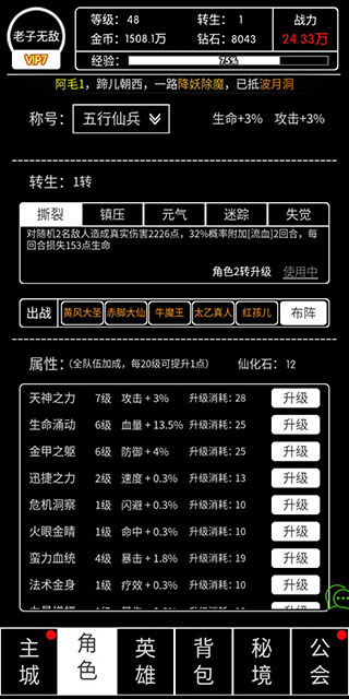 5、这里优先推荐升攻击,防御和血量,其他的加成不整么理想,把剩下的化仙石留着一转以后都不够用!这时我们战力已经提升了一个档次了,我们就可以找个可托付终身的公会。