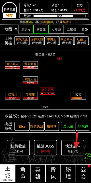 4、直接闯塔到30层停下来,后面的关卡比较难打,我们把闯塔领取的红色装备给我们首先培养的英雄(这里说一下优先培养什么英雄,比较容易招募到的英雄红孩儿,牛魔王,太乙真人,赤脚大仙,黄风大圣等等4技英雄因为后期一转必须拥有相同英雄才能转生)接着我们把闯塔得到的仙化石把角色给提升一下。