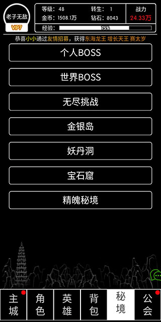7、这里主要说一下世界BOSS(因为世界BOSS是有刷新时间的,你要看准刷新时间去打,不然就被其他人刷了,极品装备和道具也几乎是这里出)其他活动推荐都是佛系玩法这里没必要讲解小伙伴们一看就明白。