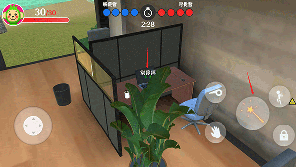 3、躲藏者需要在游戏中将自己变身为场景内的各种物品来进行躲藏,将视角对准需要变身的物品后,点击魔法棒按钮