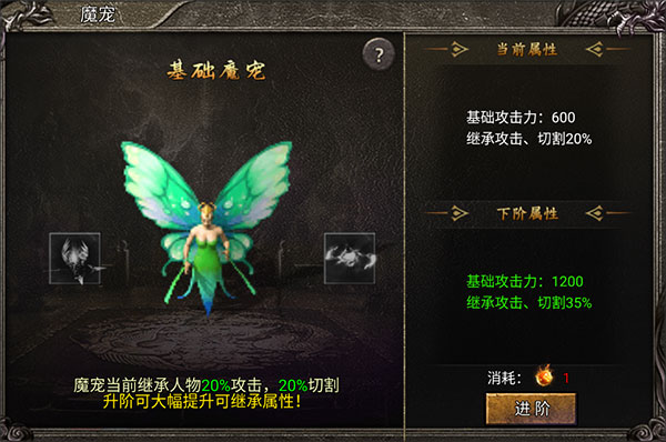 魔宠可以帮助任务击杀怪物,通过升阶可以提升继承任务的属性,可以说是挂机、PK必备。进阶材料可以通过活动获取。