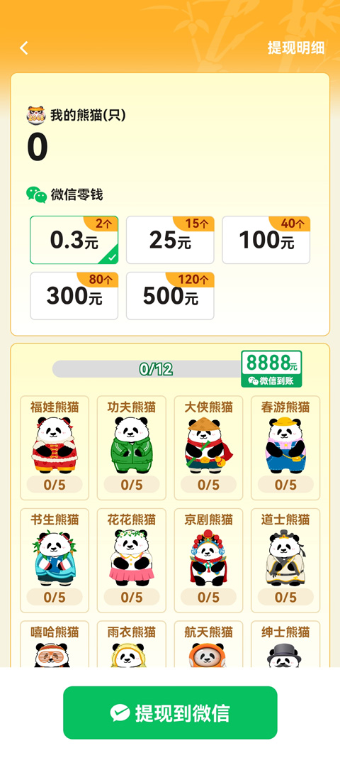 *300元提现:您在本产品中收集熊猫个数至少达到80个,累计登录天数至少达到14天,累计看广告个数达到20000个,用户等级达到30级,消耗80个熊猫可提现