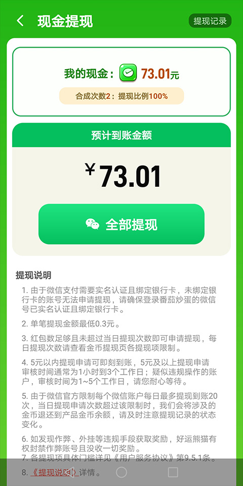 1、可提现金额=当前账户余额*当前的提现比例,提现比例通过提升合成次数提升,提现比例与合成次数关系如下:
