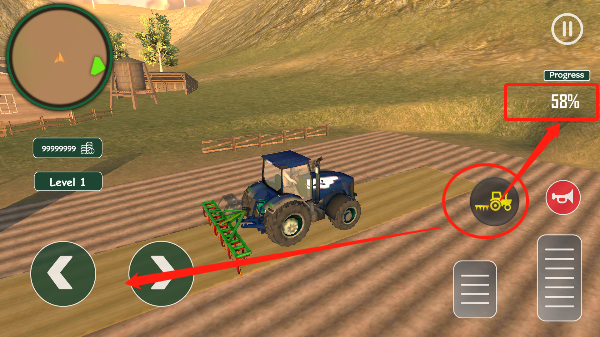 3、进入任务中,我们需要操控拖拉机收割农作物,左侧控制拖拉机移动方向,右侧控制前进与后退