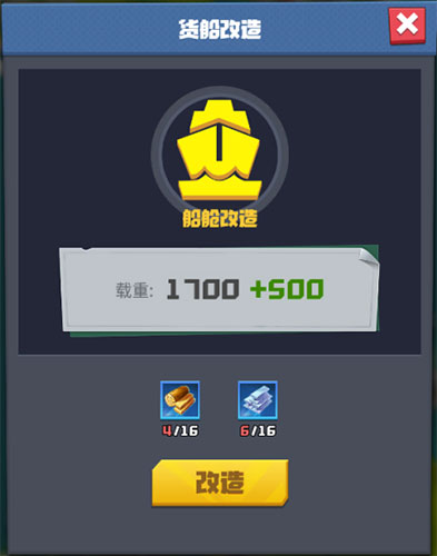 一天能跑贸易的次数是有上限的。所以为了最大化收益除了规划好贸易路线尽量把货物卖到热销的港口之外,还有一点就是提升货船的载重量,单次航行装的货多了,自然就能赚更多的钱。货船的载重量需要消耗木材和钢材这两种改造材料通过货船改造功能提升。