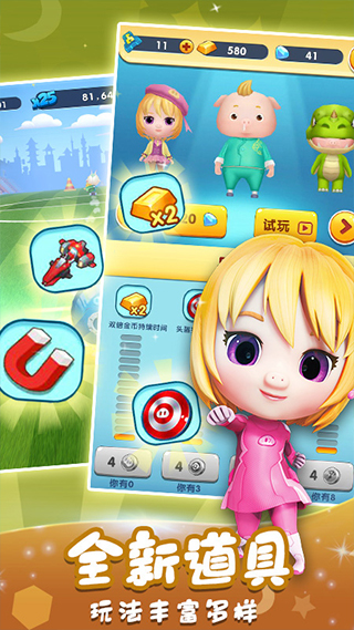 3、提供有多种道具可以使用,如飞机,安全帽,磁铁等,帮助猪猪侠跑的更远。