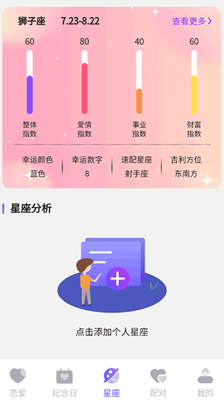 软件打开默认在星座这一栏,可以看到为您的星座准备好了今日、明日、本周、本月、年运的各种分析,从颜色到方位,都让你对以后的日子有所期盼。在恋爱一栏软件还会教您如何去恋爱、如何与对方和谐共处,大量的参考例子,让您不再畏惧和自己的爱人对话。在纪念日一栏,您可以通过新建事件,让软件来提醒你今天是个什么日子。通过把您的爱人星座和自己星座输入到软件内的配对功能内,可以为您分析出具有娱乐性质的配对参考。未来星座运势软件还有很多强大的功能,能够精准的为您分析星座学方面,现在心动的你们赶紧来下载体验吧。