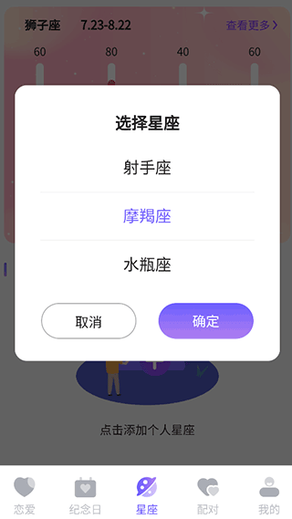 软件可以通过这些步骤来发现每日更新内容1、打开软件,默认星座一栏找到并点击“点击添加个人星座”;