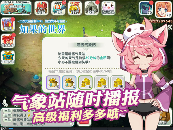 如果的世界果盘版是专门为果盘玩家所开设的一个版本,在这里,不仅有日漫风格的主角,性格各异的伙伴佣兵,还有可爱又战力十足的小萌宠,可以变形的武器,玩家们可以与好友一起开展一段匪夷所思的冒险之旅,各种福利活动,趣味任务让人目不暇接。该游戏中所有的角色都是经过精心设计的,由日本著名漫画家舘津テトsama亲自操刀所画,共提供了六大个性主角,包括靠谱的萌叔巴斯,元气的制服娘尤娜,无口双马尾萝莉萌,阳光开朗的热血少年欧力,高冷冰山男索尔,冷艳御姐艾维,能够满足玩家的所有次元幻想。除此之外,如果的世界游戏画面上非常扣主题,明亮的色调来营造游戏清新可爱的氛围,人物形象和场景设计都是偏萌&可爱的类型,整个游戏过程中无论是剧情任务、打怪PK都有种被治愈的感觉,也难怪有人评价其“看动漫不如进入这部动漫”,喜欢的小伙伴们也快加入进来吧!金币获取途径