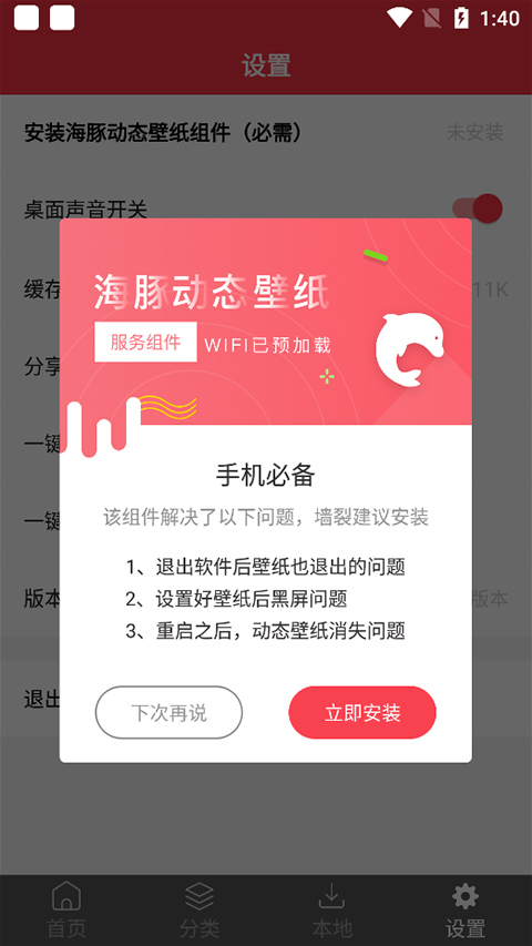 海豚动态壁纸组件是使用海豚动态壁纸app必需要安装的组件,如果用户没有安装 海豚动态壁纸app会自动检测到用户未安装的,用户只需前往海豚动态壁纸app设置页面中就可以看的到。当然如果用户没有安装时可以在设置页面中点击【安装海豚动态壁纸组件】