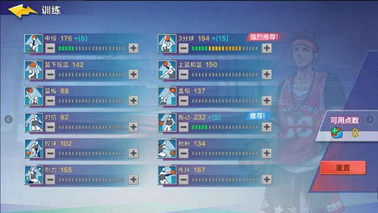 玩家可以自由选择加点,篮球手可以按推选的路线添加,也可以特立独行,自己选择;这里热血温馨提示篮球手,切记!再加点的同时不要脱离角色定位太远....