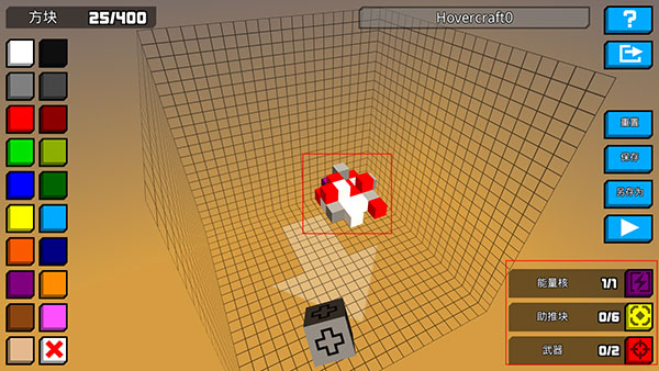 8、点击中间要放方块的位置,就可以自己设计飞船了,记得要添加能量核、助推块和武器;