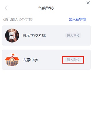若用户关联多个有效学校,则需要选择一个学校或输入授权码和姓名进入到新的学校;