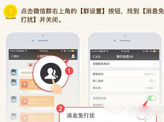 一、成功安装【秒抢红包】后先不要启动插件,请先到微信进入需要抢红包的微信群里面,在微信群的右上角【群设置】按钮,找到【消息免打扰】的选项并关闭。(注:有多个微信群的话请重复本步骤)