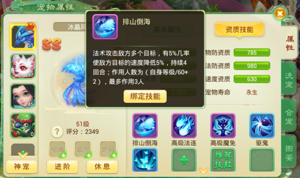 1.低级技能:宠物初级技能包含了攻击、防御、状态等技能,可作用于单体或者群体。