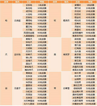 武器分为:枪、爪、剑、杖、扇、琴6种,非适用角色不可穿戴。