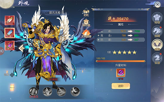 五星满时翅膀可进阶,进阶后会解锁新的翅膀外观和翅膀技能。