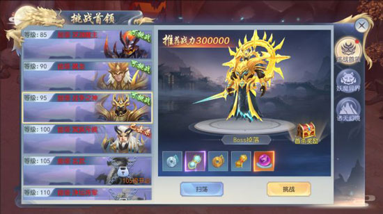 挑战首领系统根据等级挑战不同难度的首领,获得不同的挑战奖励。挑战首领界面会有BOSS列表,方便查看BOSS挑战状态,可以看到首杀记录、广播等内容。