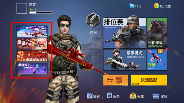 2、在主界面中可以选择想要体验的模式,有排位赛、生化模式、娱乐模式等模式