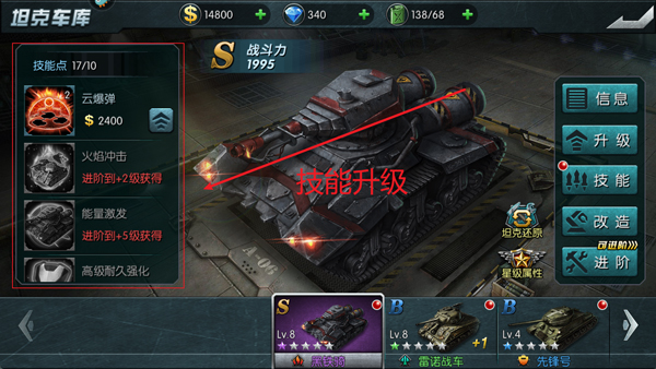 1、每辆坦克都有四个技能,但是每个技能都需要解锁,解锁技能需要坦克进行进阶升级依次是:C级、B级以及A级