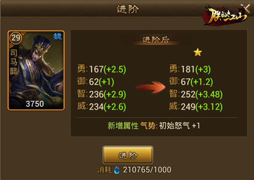 所有武将都能通过消耗武魂进阶,并大幅提高武将的属性。不由得感叹:橙将诚可贵,武魂价更高,想变强,刷武魂!
