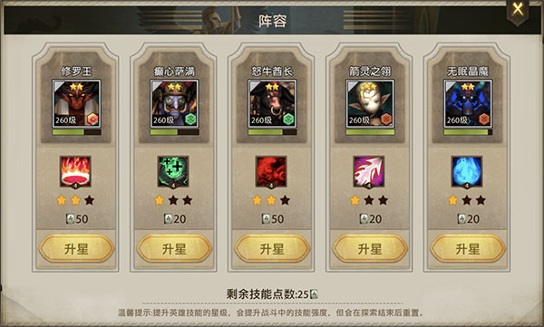 阵容(技能):探索中打怪可以获得技能(书)点数,用来提升战斗时,英雄技能星级,增强战斗强度,探索结束后重置。