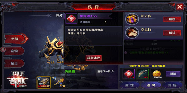 点击下方进阶按钮,集齐所需材料,即可进阶坐骑,进阶后坐骑外形会发生变化,点击材料部分可以查看材料获取来源。