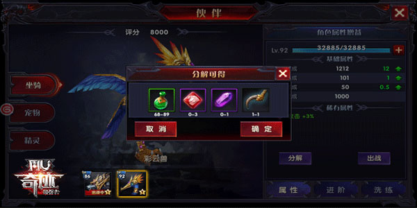 在坐骑界面,点击右下角按钮,可以选择,分解、出战、休息。