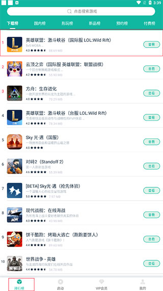 1、排行榜在OurPlay极速版官方版首页当中,你将可以看到热门手游实时排行,以下载榜、国内榜、热玩榜以此排列出来。