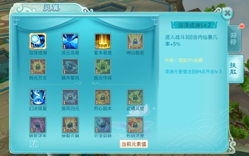 灵翼除了给大侠提供属性加成,在羽符的元素值达到一定后,还会解锁羽翼技能。