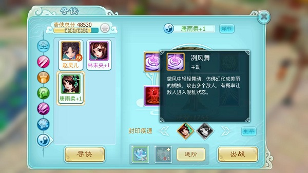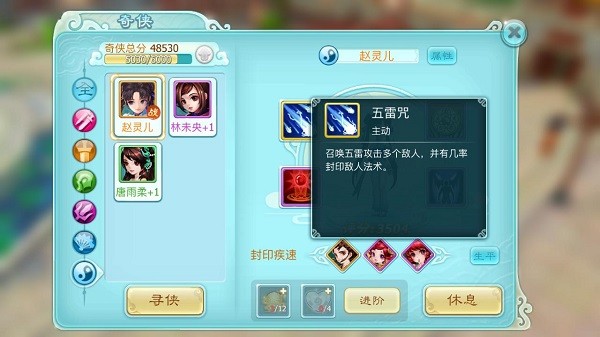 首先介绍赵灵儿,这位女娲后裔的特殊技能是五雷咒,此技能可以攻击多个敌人,并有几率封印敌人的法术。其他三个技能是摄灵、迷离斩、鬼降。