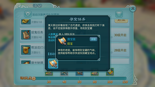 寻宝任务,获得的寻宝鼠也可以挖到铜钱,但是同样产出较少,每日10个宝图,大概产出5000左右铜钱。